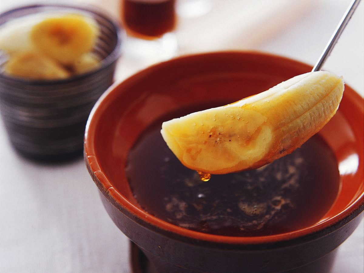- Plonger les brochettes de bananes congelées dans la préparation, les tourner pour les enduire du sirop et les mettre sur un plateau.