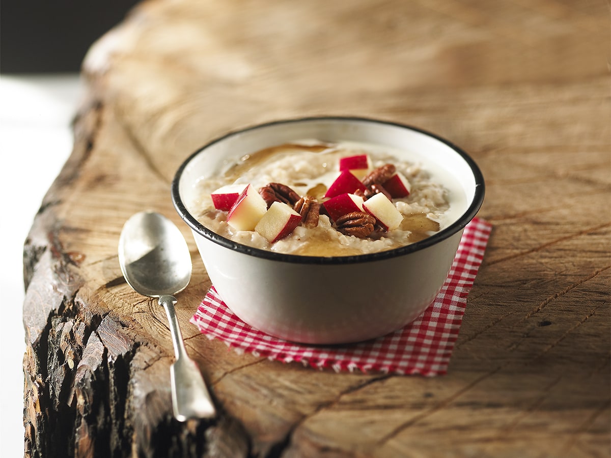 - Verser le gruau chaud dans des bols et décorer avec les fruits réservés et les noix. Servir aussitôt.