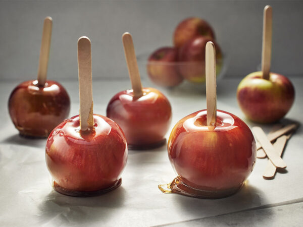 - Entre-temps, insérer un bâton de bois au centre de chaque pomme. Tremper les pommes une à une dans le caramel chaud. Retirer le surplus de caramel avec une spatule et déposer, tête en bas, sur la plaque.