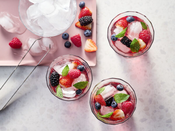 - Ajouter l’eau pétillante et les petits fruits, puis bien mélanger.
